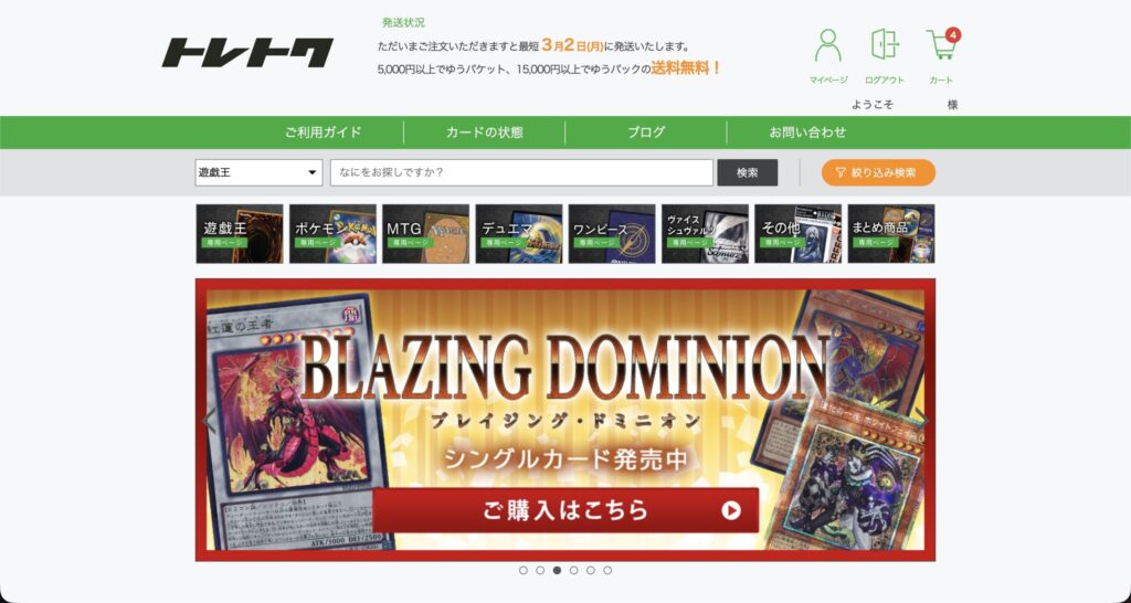 トレトクさんのトップページはこんな感じで、総合トップは遊戯王になっています。