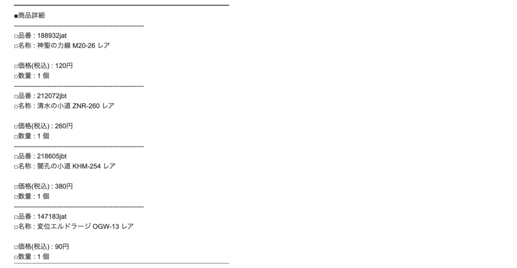 おそらくメールで届いたのはカートに入れた順で、明細書はカードランク順かな。この辺は商品の管理体制とECサイトへの反映、補充記録に何らか関連していそうですが、さすがに詳細は分からないですね。
