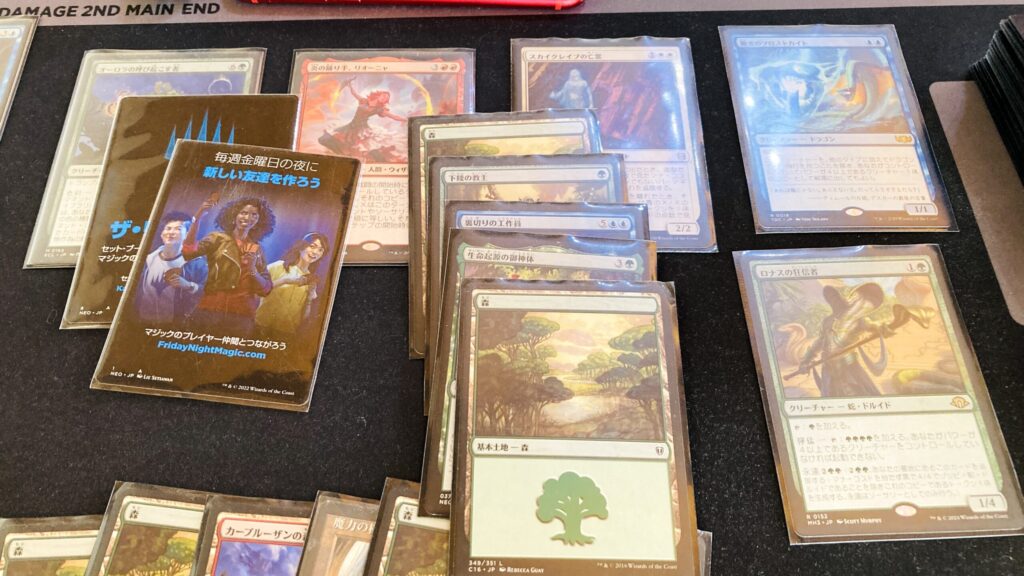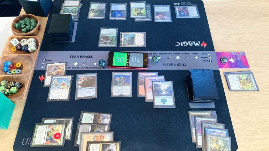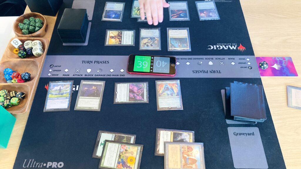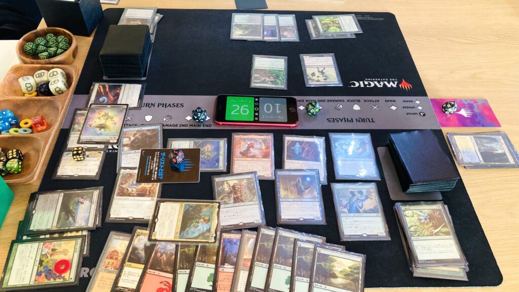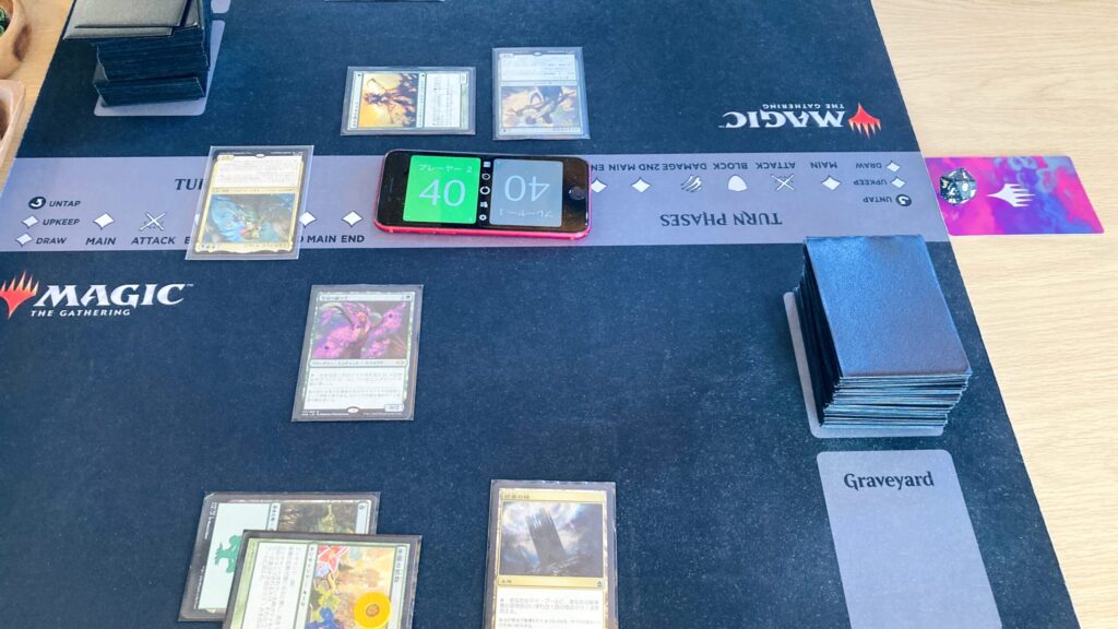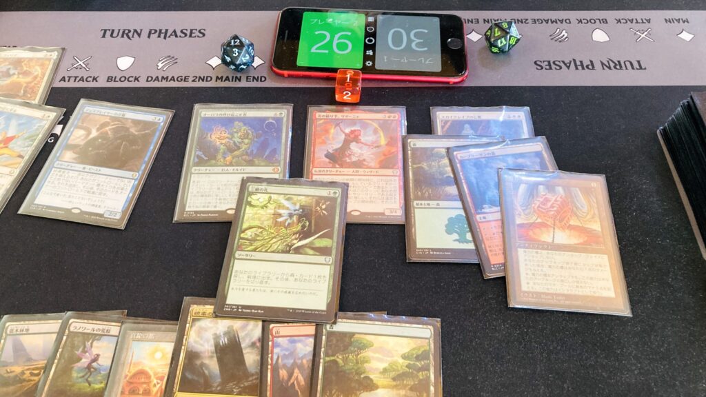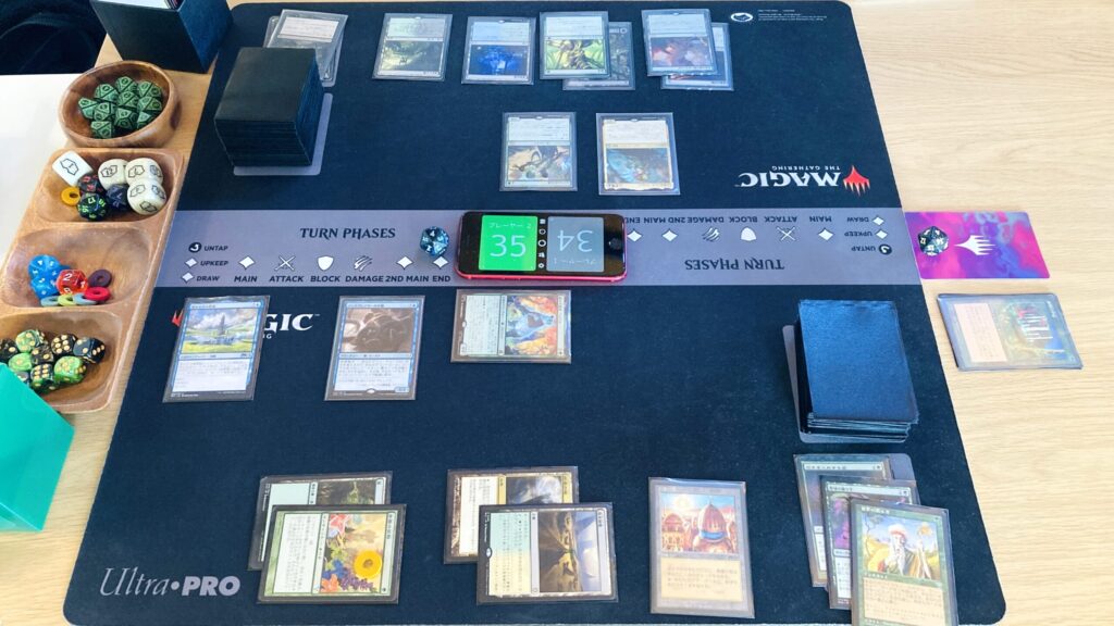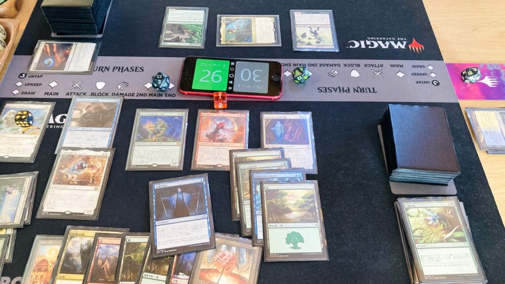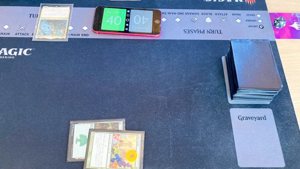 今回は妻が先手。1:1ですがデュエルコマンダーではないので、禁止カードもEDH準拠なのはいつも通り。