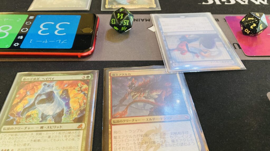 というわけで、アタルカはスパイダーセンスにより誘発型能力が打ち消され、ただの8/8飛行トランプルのドラゴンとして着地。振り分けがなくなったのは痛いけど、まあ生物としても割と脅威なのが救いか。