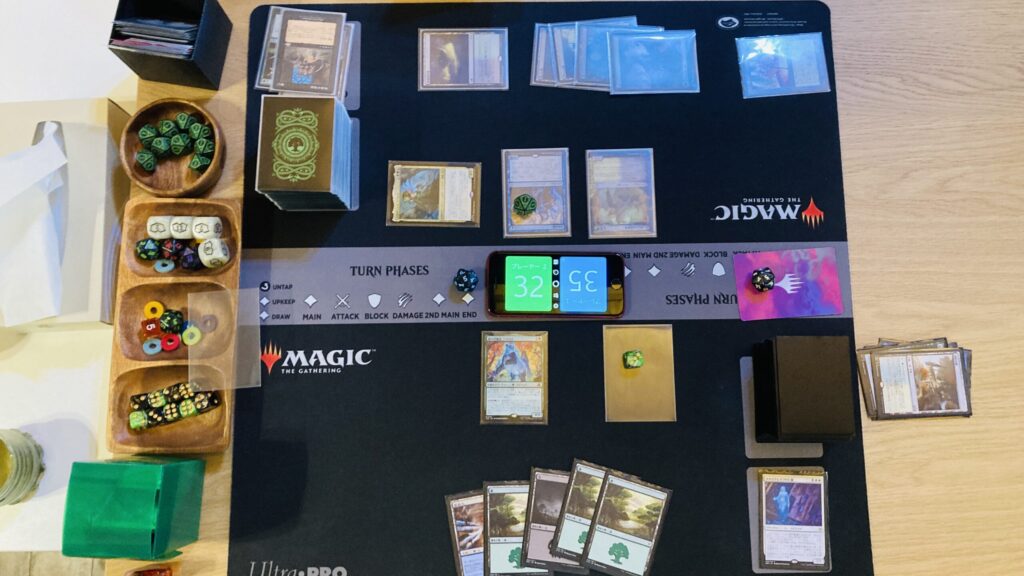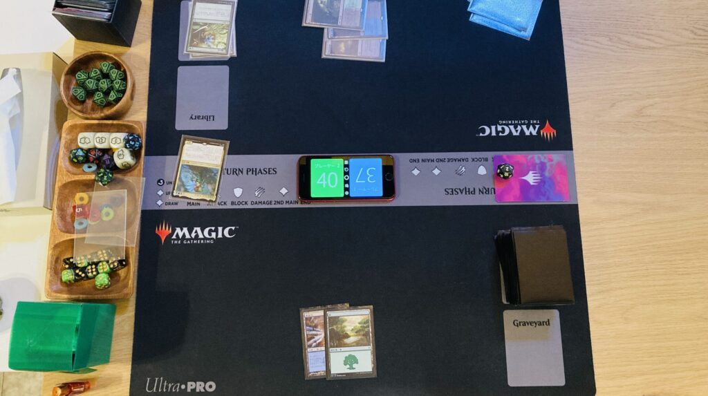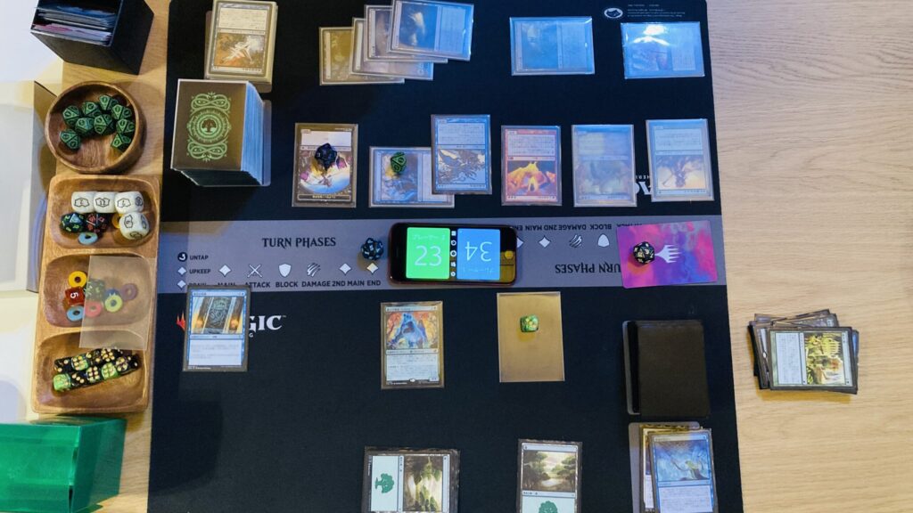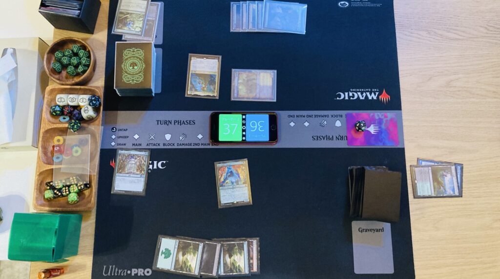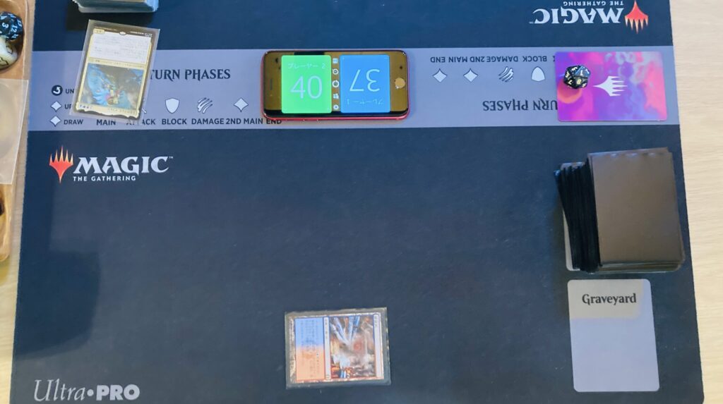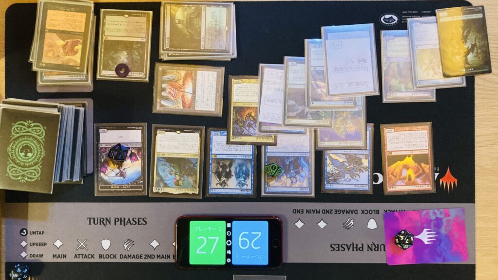 今回は妻が先手。1vs1ですがデュエルコマンダーではないので、禁止カードもEDH準拠なのはいつも通り。
